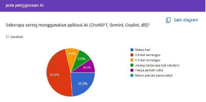 Pola penggunaan aplikasi AI seperti ChatGPT, Gemini, atau Copilot dalam survei ini menunjukkan variasi frekuensi yang menarik di antara responden. Data yang diperoleh dari 21 jawaban mengungkapkan bahwa sebagian pengguna sudah mengintegrasikan teknologi ini ke dalam rutinitas harian mereka. Namun, persentase yang signifikan juga menunjukkan bahwa penggunaan AI masih bersifat kadang-kadang atau bahkan belum pernah dicoba sama sekali oleh beberapa individu.