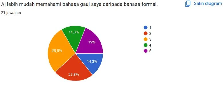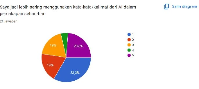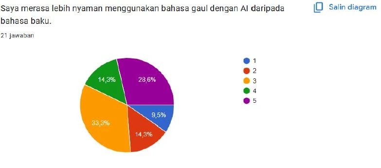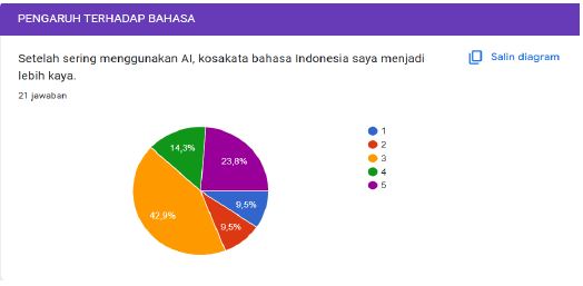 Walalupun hasil survey, menjukan responden memilih skala 3 (netral) dengan persentase 23,8% dalam menilai apakah penggunaan AI memperkaya kosakata bahasa Indonesia mereka, yang menunjukkan bahwa banyak pengguna belum merasakan dampak yang jelas atau signifikan dari interaksi dengan AI terhadap kekayaan kosakata, baik dalam bahasa gaul maupun formal, karena dalam praktiknya AI lebih sering dimanfaatkan sebagai alat yang responsif dan solutif untuk memberikan jawaban langsung sesuai kebutuhan tanpa secara aktif mendorong pengenalan variasi kosakata baru atau eksplorasi kebahasaan yang lebih mendalam, sehingga interaksi yang terjadi cenderung bersifat praktis dan efisien, bukan sebagai proses pembelajaran bahasa, sementara dominannya pilihan netral juga mencerminkan adanya keraguan responden dalam menilai pengaruh AI yang mungkin bersifat bertahap atau belum konsisten dalam memberikan paparan bahasa yang beragam, yang pada akhirnya menegaskan bahwa potensi AI dalam memperkaya kosakata sangat bergantung pada pola penggunaan oleh pengguna serta desain sistem AI itu sendiri dalam mendorong pengembangan kemampuan linguistik.