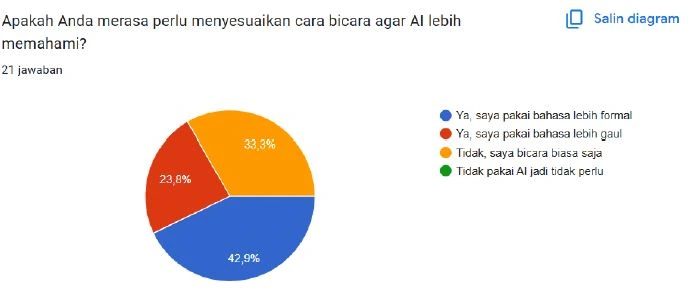Hasil survei menunjukkan bahwa sebagian besar pengguna merasa tidak perlu mengubah cara berbicara saat berinteraksi dengan AI dan tetap menggunakan bahasa sehari-hari. Namun, sebagian responden memilih menyesuaikan gaya bahasa, baik dengan menggunakan bahasa formal agar lebih mudah dipahami AI, maupun bahasa gaul karena dianggap lebih santai. Perbedaan pilihan ini mencerminkan pandangan yang beragam tentang cara AI memproses bahasa, sekaligus menunjukkan tantangan bagi pengembangan AI agar mampu memahami berbagai ragam bahasa Indonesia tanpa memaksa pengguna mengubah gaya berbahasa mereka.