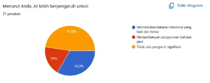 Hasil survei menunjukkan bahwa hampir setengah responden menilai AI belum memberikan dampak besar terhadap perkembangan bahasa Indonesia. Sebagian responden melihat AI berperan dalam menjaga penggunaan bahasa baku karena cenderung mengikuti kaidah yang benar dan terstruktur. Di sisi lain, ada pula yang menilai AI ikut mendorong penggunaan bahasa gaul melalui pola interaksi yang lebih santai dan fleksibel. Perbedaan pandangan ini menunjukkan bahwa persepsi pengguna terhadap pengaruh AI masih beragam dan belum mengarah pada kesimpulan tunggal. Banyak pengguna bersikap hati-hati karena perubahan bahasa dianggap terjadi secara perlahan dan tidak langsung. Selain itu, peran AI sering dipandang hanya sebagai alat bantu, bukan faktor utama pembentuk kebiasaan berbahasa. Secara umum, AI belum dianggap mampu mengubah arah perkembangan bahasa Indonesia secara signifikan.